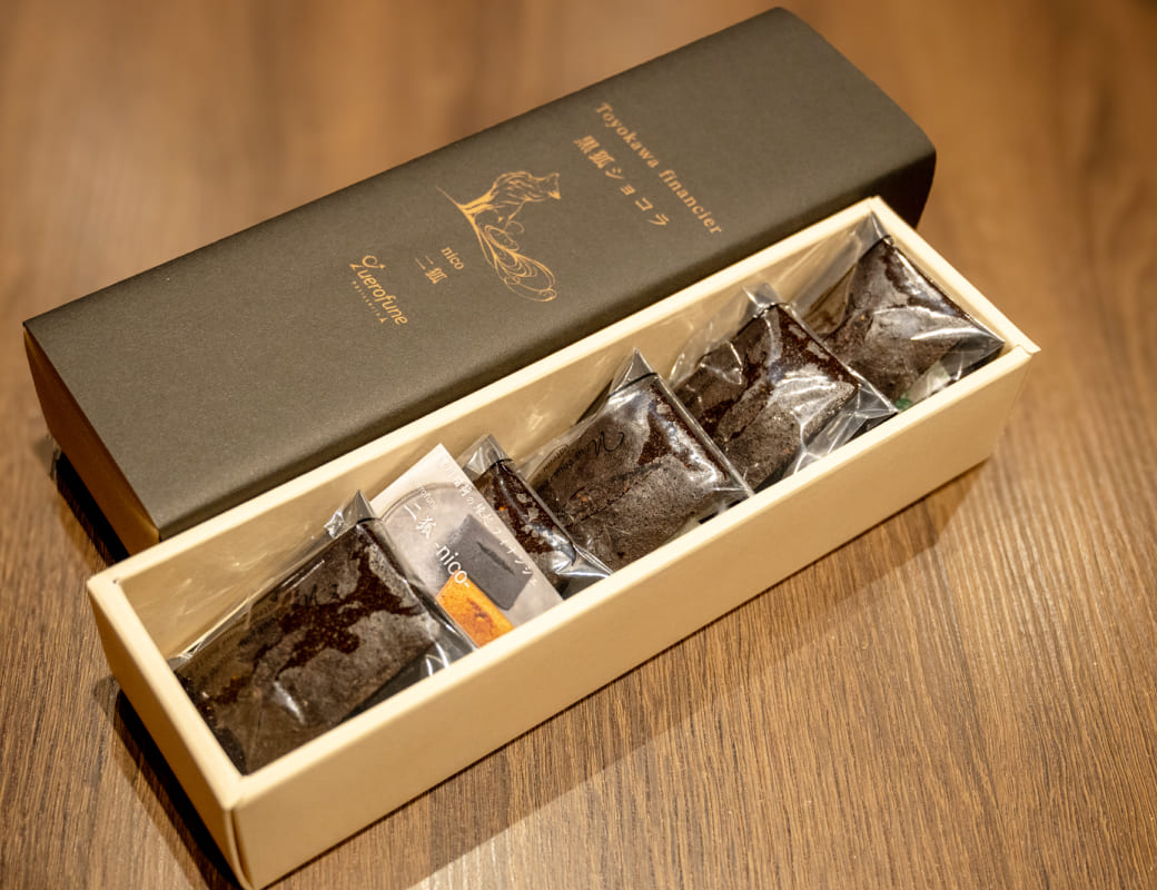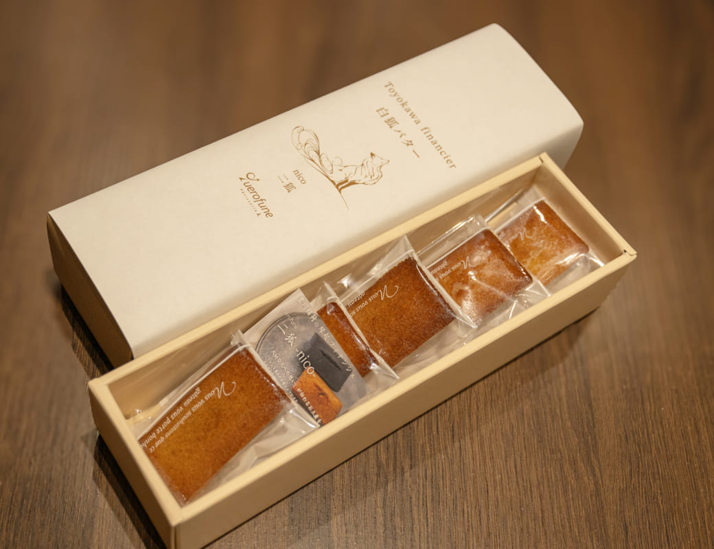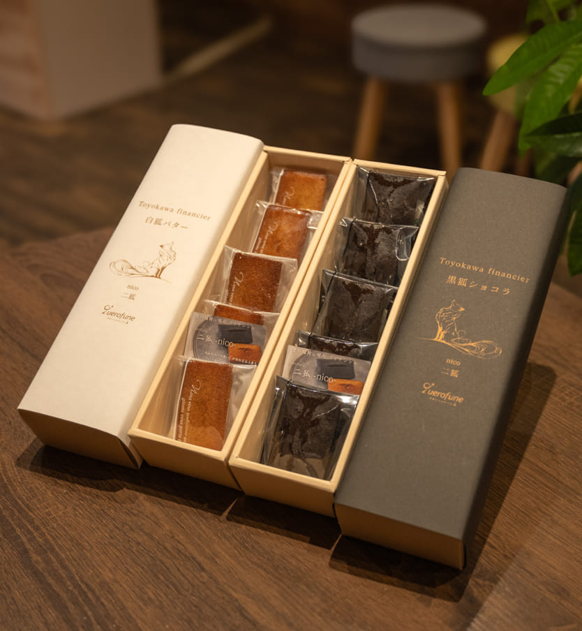 「クレープの感動を持ち帰りたい」という声から生まれたフィナンシェ。モチーフは豊川稲荷の“黒狐”と“白狐”。